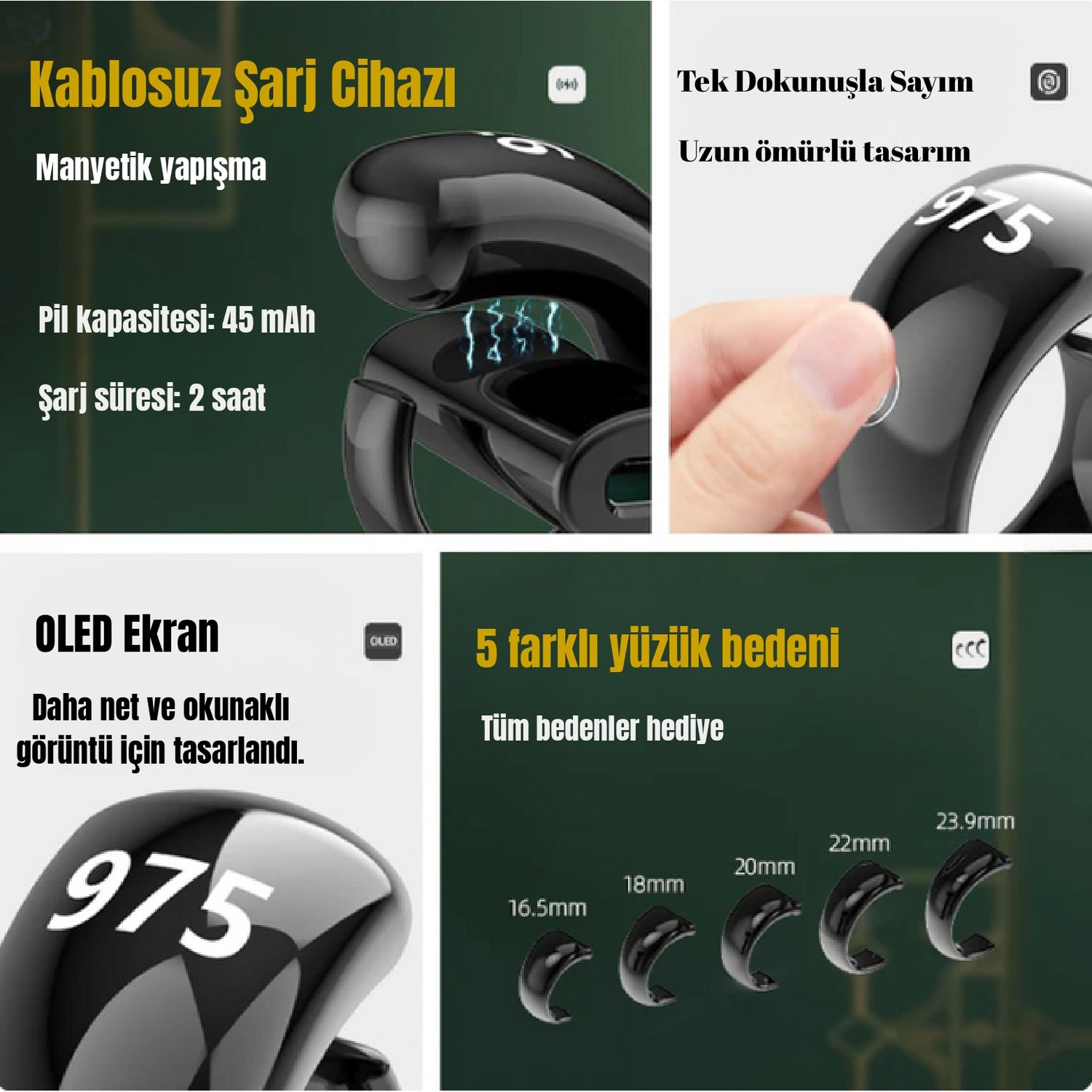 Avuç içine sığan, ultra hafif bu dijital zikir yüzüğü; tek dokunuşla sayım yapar, günün her anında farkındalığınızı canlı tutar. Gelenekselden ilham alan modern tasarımıyla huzuru teknolojiyle buluşturur.